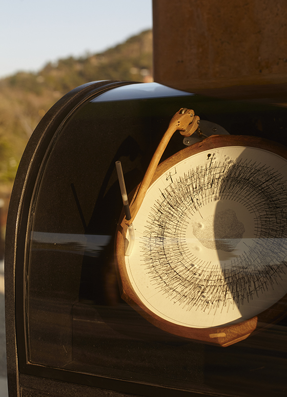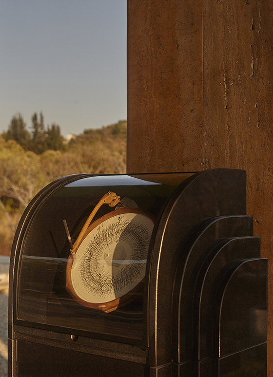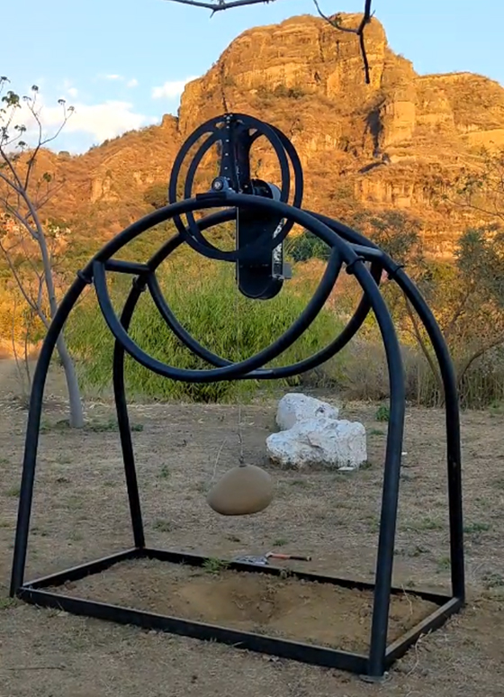 Mecanismo compuesto por un disco de placa de acero de 120 cm de diámetro que gira montado en una estructura de metal movido por un motor. El disco arrastra dos piedras con un cable de acero y las deja caer al piso de forma consecutiva desde una altura de metro y medio con un intervalo de medio segundo generando un sonido similar al del latido de un corazón.